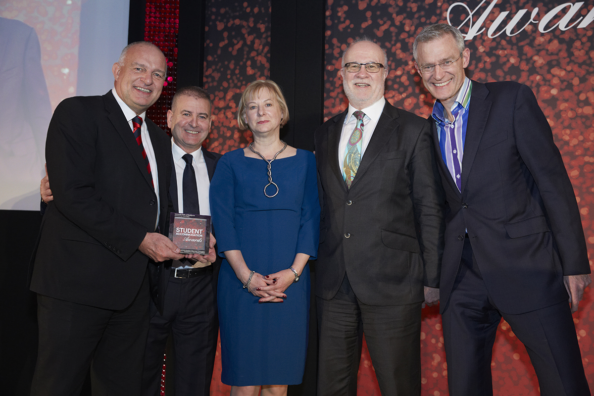 The Holyrood North Residence Hall, which was designed by the University of Edinburgh in partnership with Balfour Beatty and its design team and is operated by the University, beat stiff competition from seven other entries to scoop the award, during the inaugural ceremony at the Marriott Hotel in Grosvenor Square, London. (Photo l-r Billy Smith, Relationship Directory, David Phillips Student Furniture (award sponsor); Ian Woosey, Investment Director, Balfour Beatty; Elizabeth Beattie, Assistant Director Property, University of Edinburgh; Richard Kington, Director, Accommodation Catering and Events at The University of Edinburgh and finally the host Jeremy Vine.)